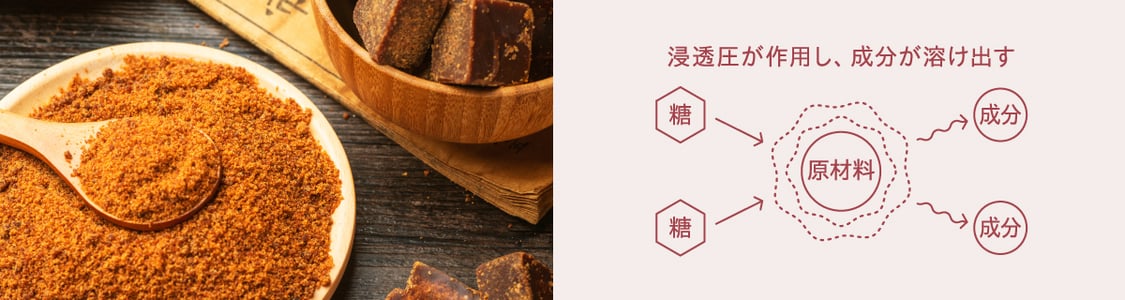 原材料に糖を加えることで、浸透圧が作用して、細胞内に閉じ込められた成分がゆっくりと溶け出します。