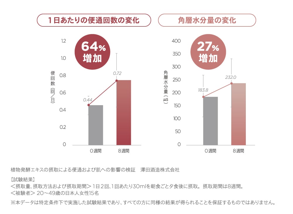 発酵エキスを継続して摂取することで、便通回数や、肌の水分量に前向きな変化が。