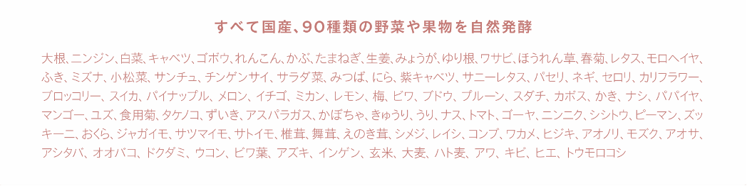 厳選された90種の国産の野菜・果物・穀物・海藻・野草を原料とし、酵母や酵素の働きで熟成発酵させた植物性の発酵飲料。